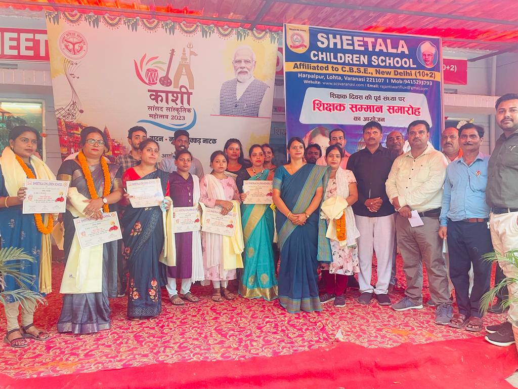 वाराणसी,लोहता । हरपालपुर स्थित शीतला चिल्ड्रेन स्कूल प्रांगण में हर साल की तरह इस साल भी धूमधाम से शिक्षक दिवस मनाया गया| इस अवसर पर विद्यालय द्वारा लगभग 150 शिक्षकों को अंग वस्त्र कलम एवं पुरस्कार देकर सम्मानित किया गया। कार्यक्रम में मुख्य अतिथि के रूप में वाराणसी जिला पंचायत अध्यक्ष श्रीमती पूनम मौर्या ने शिक्षकों को सम्मानित करते हुए उनके महिमा का गुणगान किया और कहा कि शिक्षक राष्ट्र के निर्माण में अहम भूमिका निभाते हैं| विशिष्ट अतिथि के रूप में सुनील कुमार मिश्रा ने कहा कि डॉक्टर सर्वपल्ली राधाकृष्णन के जन्म दिवस को शिक्षक दिवस के रूप में मनाया जाता है| कार्यक्रम की अध्यक्षता कर रहे विद्यालय के प्रबंधक राजन तिवारी ने कार्यक्रम में उपस्थित समस्त शिक्षक एवं अतिथियों का धन्यवाद किया| कार्यक्रम में मुख्य वक्ता के रूप में शिक्षक संघ के प्रदेश उपाध्यक्ष रविंद्र कुमार सिंह,ने अपना विचार व्यक्त किए | प्रधानाचार्य चंद्रधर तिवारी ने भी उपस्थित शिक्षकों का सम्मान एवं उनकी महिमा का गुणगान किया| कार्यक्रम में मुख्य रूप से नोडल शिक्षक राजकुमार,नोडल ब्लॉक प्रभारी विनोद कुमार पाण्डेय,उषा सिंह,क्षमता सिंह, संतोष कुमार सिंह, अखिलेश कुमार यादव,शशांक पाण्डेय,हरिराम पंकज कुमार पाठक, सोनल केसरी,सरिता,संगीता यादव, वीरेंद्र प्रताप,सरोज गौड़,आर•एस• पाण्डेय,एम•पी•शुक्ला,संगीता सिंह, अर्चना जायसवाल,शिवम जायसवाल आदि | वक्ताओं ने अपना विचार व्यक्त किये, कार्यक्रम का संचालन डॉक्टर रविकांत तिवारी ने किया |