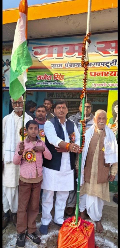 रामेश्वर। ग्रामीण क्षेत्र में 76 वां गणतन्त्र दिवस आदर्श मांडल ग्राम पंचायत जगापट्टी के ग्राम सचिवालय पर रविवार को मुख्यमंत्री पंचायत प्रोत्साहन पुरस्कार से सम्मानित ग्राम प्रधान घनश्याम सिंह यादव ने ध्वजारोहण करते हुए इस पर्व को बड़े धूमधाम के साथ मनाया। यहां पर पूरे दिन खुशी का माहौल बना रहा। ग्राम सचिवालय पर मुस्लिम बंधुओ ने गंगा जमुनी तहजीब के तहत भाई चारा का संदेश देते हुए खुशी पूर्वक गणतंत्र दिवस को मनाया।